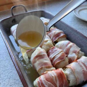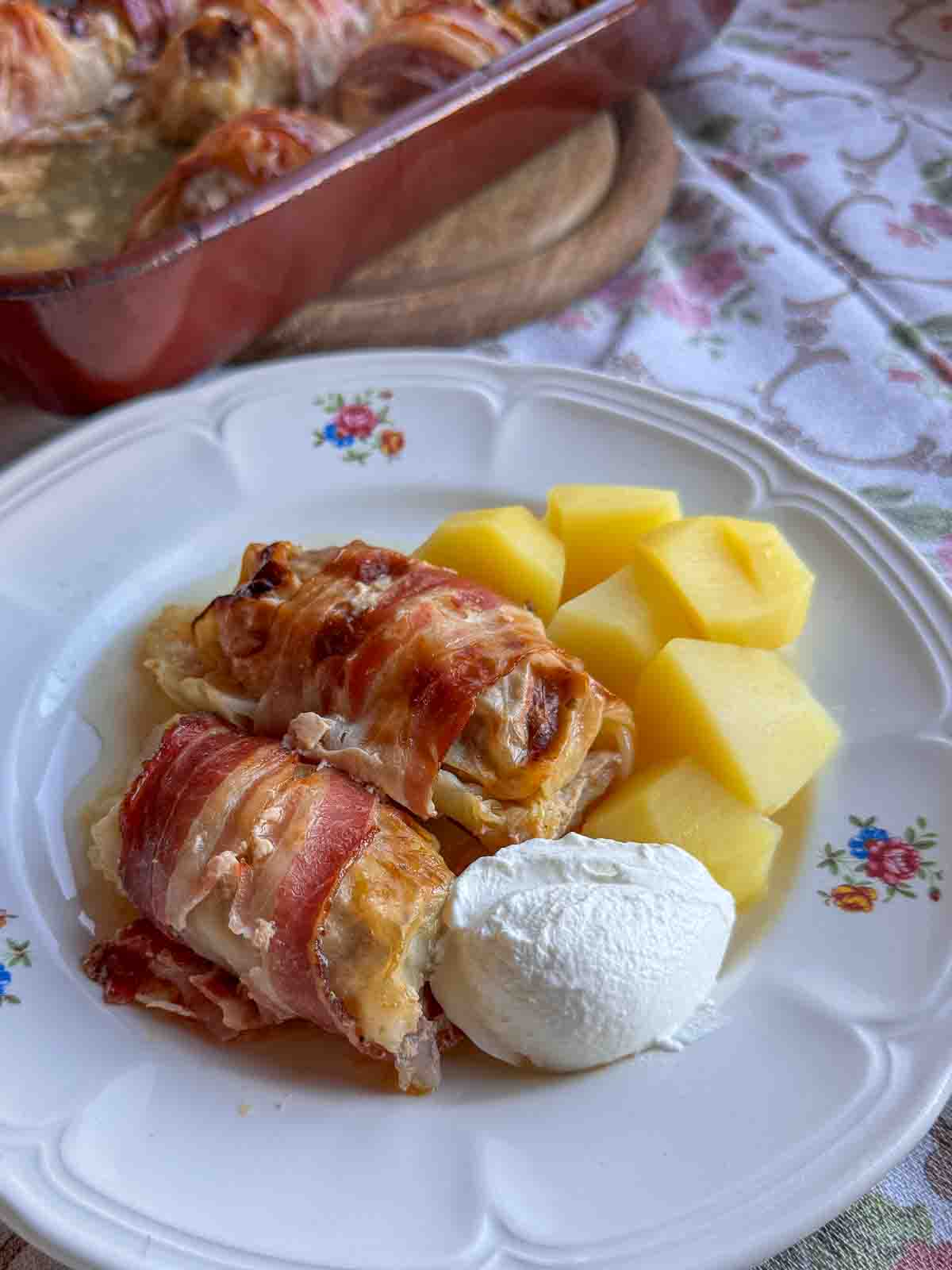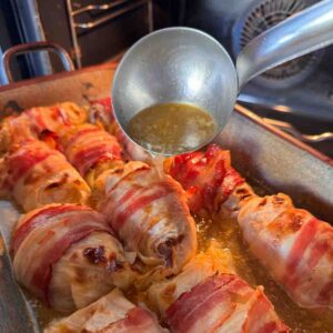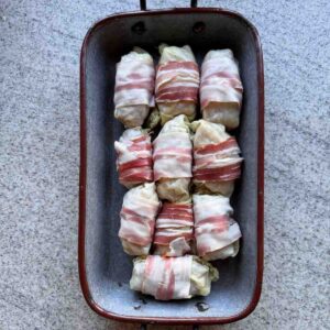 Tender cabbage rolls filled with a mixture of ground meat, spices, and egg, wrapped in bacon, and gently braised in the oven with a bit of broth.