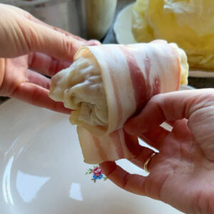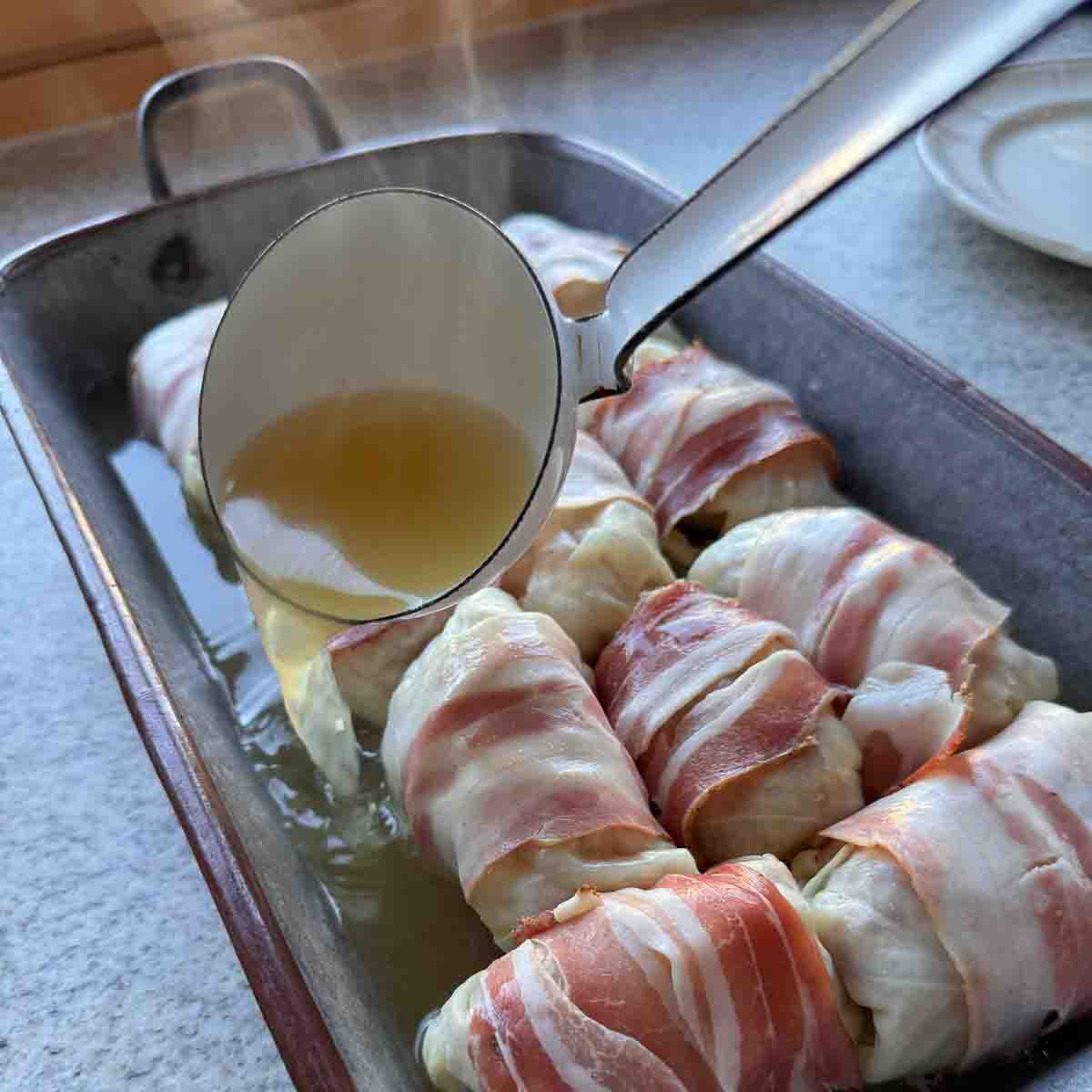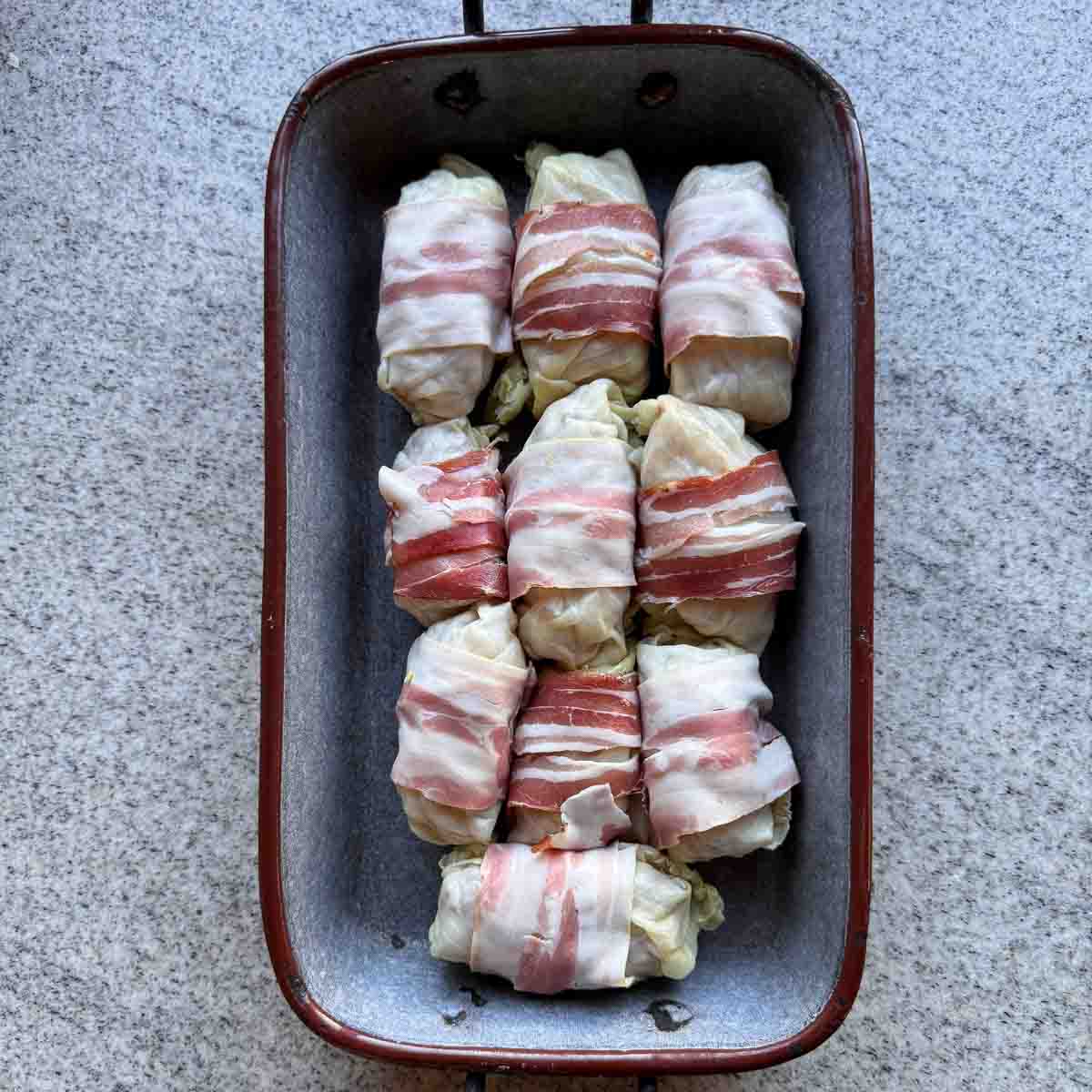 For this recipe, a filling made of ground meat, spices, and egg is wrapped in boiled cabbage leaves. The rolls are then wrapped in bacon, topped with a bit of broth, and gently braised in the oven.