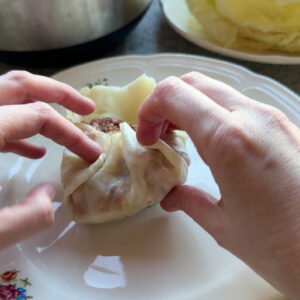 Fold each cabbage leaf halfway over the filling, then tuck in the sides, and roll it up completely.