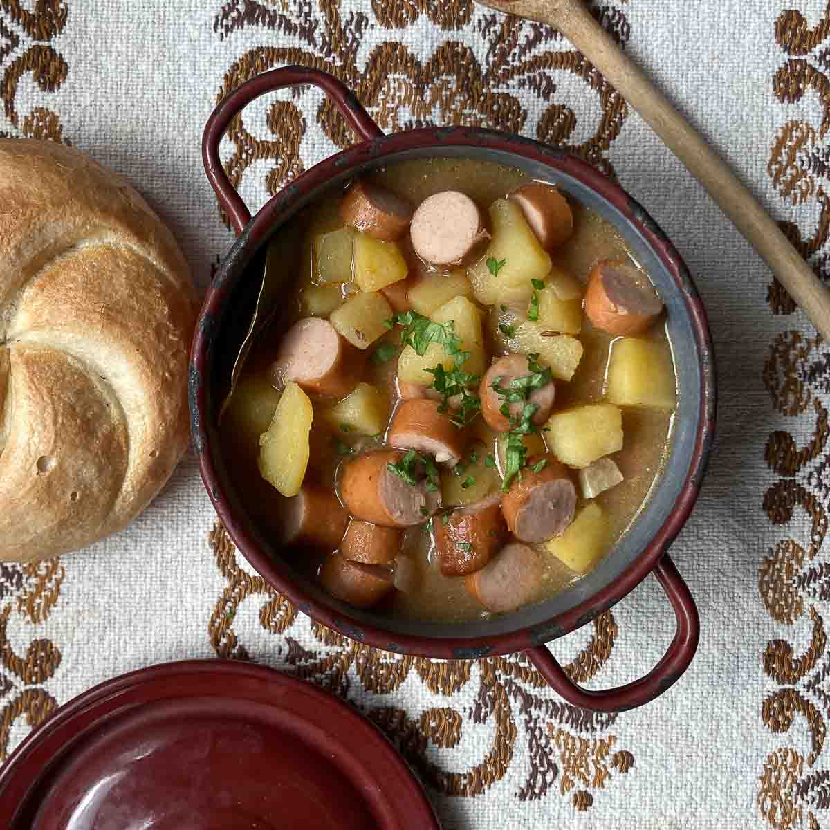 In our family, Viennese potato goulash is the classic “after a family gathering” meal (which is cooked, when there are lots of leftover sausages from a party). It cooks quickly and keeps well in the fridge for several days.